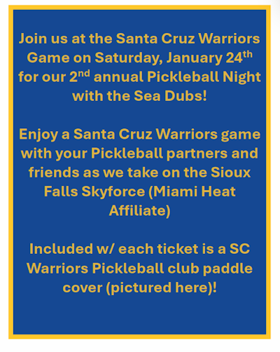 Member Events and Tournaments Join/Renew Membership Santa Cruz Warriors Pickleball night on 1/24/26. Order Tickets Here. Past Events andTournaments Halloween Tournament 2025 October 31, 2025 Halloween Tournament October 31, 2025 Our members... Club Party 2025 October 11, 2025 Our annual Club Party was held on Saturday... Hawaiian Tournament 2025 July 21, 2025 Hawaiian Tournament – July 21, 2025 Our... Kings and Queens 2025 July 15, 2025 Kings and Queens – July 15, 2025 Our Kings... Dinko de Mayo 2025 May 5, 2025 Dinko de Mayo – May 5, 2025 Our Dinko de... Pickling With a Purpose 2024 December 10, 2024 Pickling With a Purpose – 12/10/2024 A... Halloween Tournament 2024 October 31, 2024 Halloween Tournament 2024 Additional pictures are... Holiday Party 2024 October 19, 2024 Holiday Party at Bargetto Winery 2024 Additional...